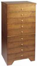 Shown in Walnut finish. Constructed with solid hard maple drawer fronts. Top and sides are maple veneer. Dimensions are 32 in. high, 16 in. wide, and 14 in. deep. Brass drawer pulls. Can be shipped UPS.